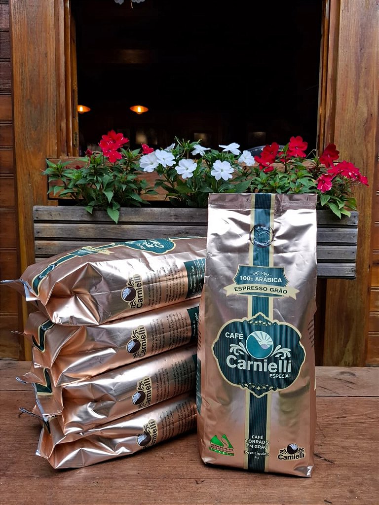 Kit com 5 unidades de Café Torrado em Grão Espresso Especial 1kg, totalizando 5kg de café. Café 100% arábica, cereja descascado, torrado e mantido em grão. É ideal para fazer café espresso com sabor e aroma especiais, que trazem à memória notas caramelizadas e achocolatadas, proporcionando uma experiência inesquecível ao apreciá-lo. Há mais de um século produzindo café, a família Carnielli apresenta o café especial, produzido nas Montanhas do Espírito Santo com o aroma e sabor que você nunca sentiu.